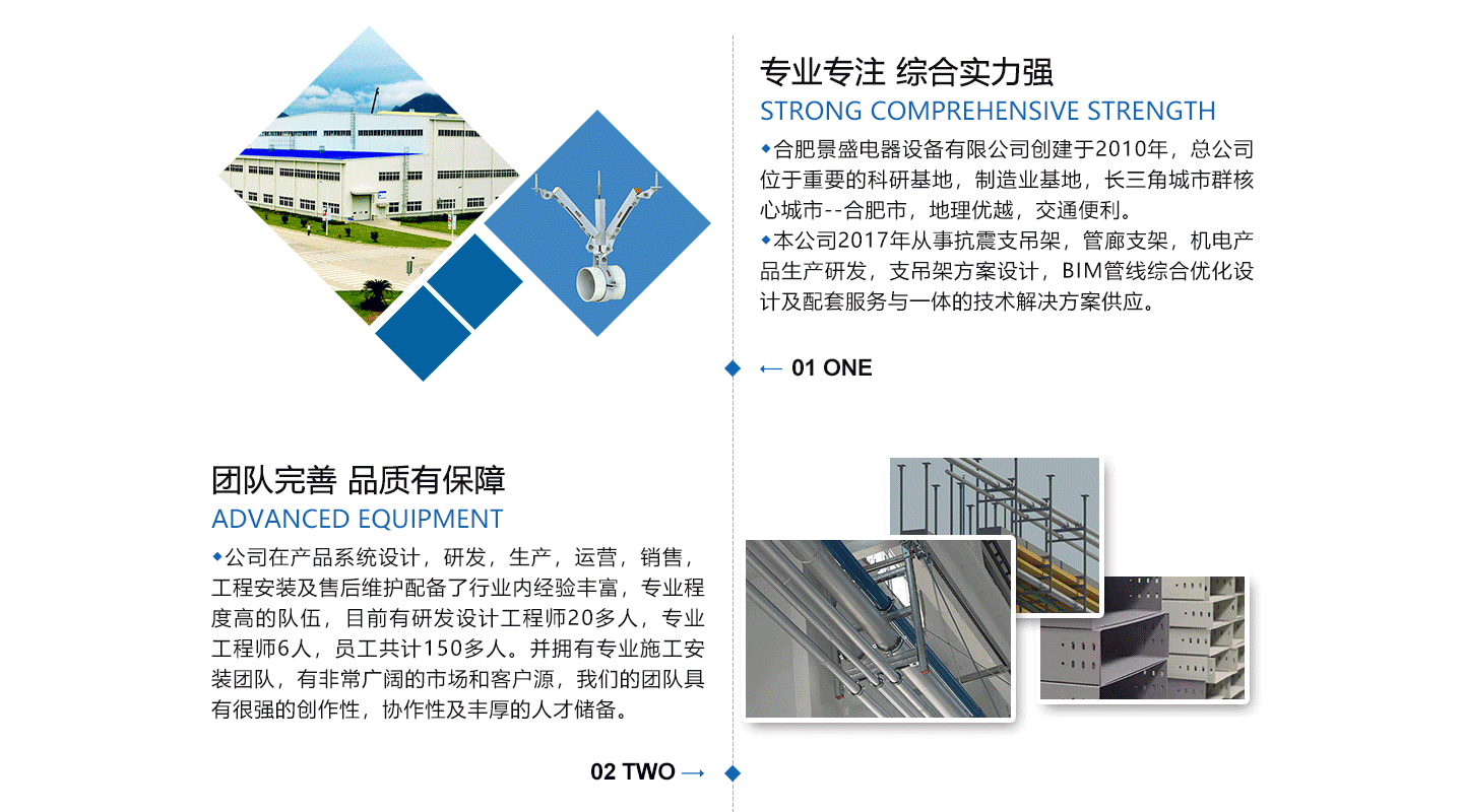 合肥景盛電器設(shè)備有限公司創(chuàng)建于2011年,注冊(cè)資本3000萬(wàn),總公司位于中國(guó)重要的科研基地,制造業(yè)基地,長(zhǎng)三角城市群中心城市-----合肥市,地理位置好,交通方便。本公司2017年從事抗震支吊架,電纜橋架,機(jī)電產(chǎn)品生產(chǎn)研發(fā),支吊架方案設(shè)計(jì),BIM管線綜合優(yōu)化設(shè)計(jì)及配套服務(wù)與一體的技術(shù)解決方案供應(yīng)。公司在產(chǎn)品系統(tǒng)設(shè)計(jì),研發(fā),生產(chǎn),運(yùn)營(yíng),銷(xiāo)售,工程安裝及售后維護(hù)配備了行業(yè)內(nèi)經(jīng)驗(yàn)豐富,服務(wù)程度高的隊(duì)伍,目前有研發(fā)設(shè)計(jì)工程師20多人,工程師6人,員工共計(jì)150多人。并擁有施工安裝團(tuán)隊(duì),有非常廣闊的市場(chǎng)和客戶源,我們的團(tuán)隊(duì)具有很強(qiáng)的創(chuàng)作性,協(xié)作性及豐厚的人才儲(chǔ)備。 公司先后通過(guò)ISO9001:2015質(zhì)量管理體系認(rèn)證...